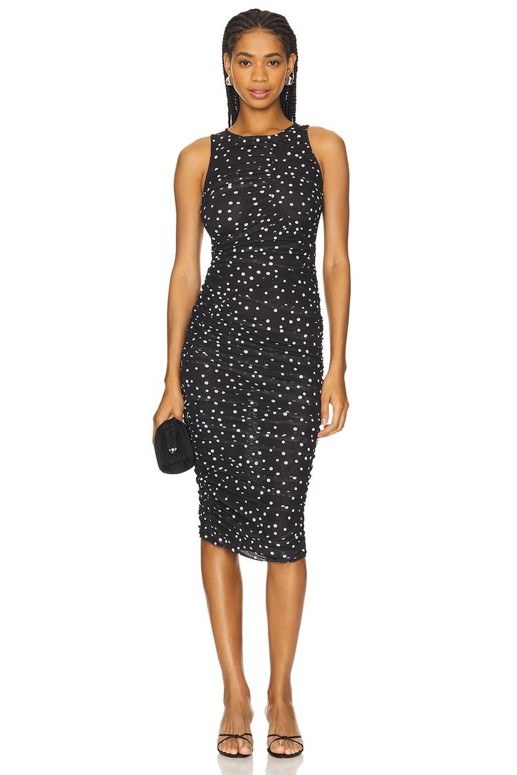 This matte black midi sheath dress features a classic round neckline and sleeveless cut, perfectly showcasing a figure-hugging bodycon fit. The all-over white polka dot print adds a playful yet sophisticated touch, enhanced by ruched detailing on the front and back that flatters the silhouette. Crafted from a midweight mesh blend of polyester, elastane, and nylon, it offers comfort and stretch with a smooth fully lined finish. The hidden back zipper closure maintains sleek lines, making it ideal for cocktail events, date nights, or stylish evening outings.