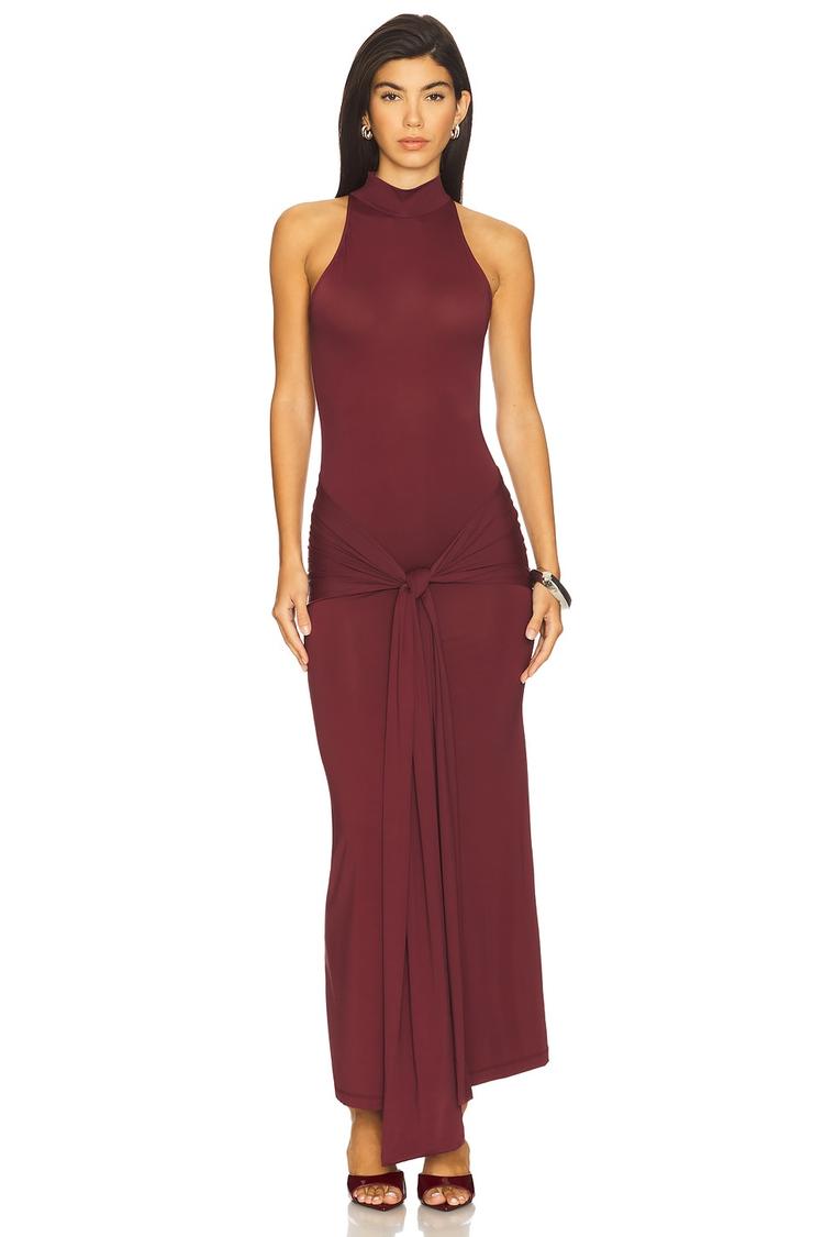 A sleek silhouette with a high neckline and sleeveless design showcases modern elegance in this matte burgundy column maxi dress. Crafted from midweight nylon-elastane jersey, it offers a flattering bodycon fit with a distinctive front draped tie accent that enhances its minimalist appeal. The clean hemline and covered back complete the refined look, making it an ideal choice for date nights, cocktail parties, and stylish evenings out. Effortlessly chic, this slip-on dress combines comfort with sophisticated style for versatile all-weather wear.