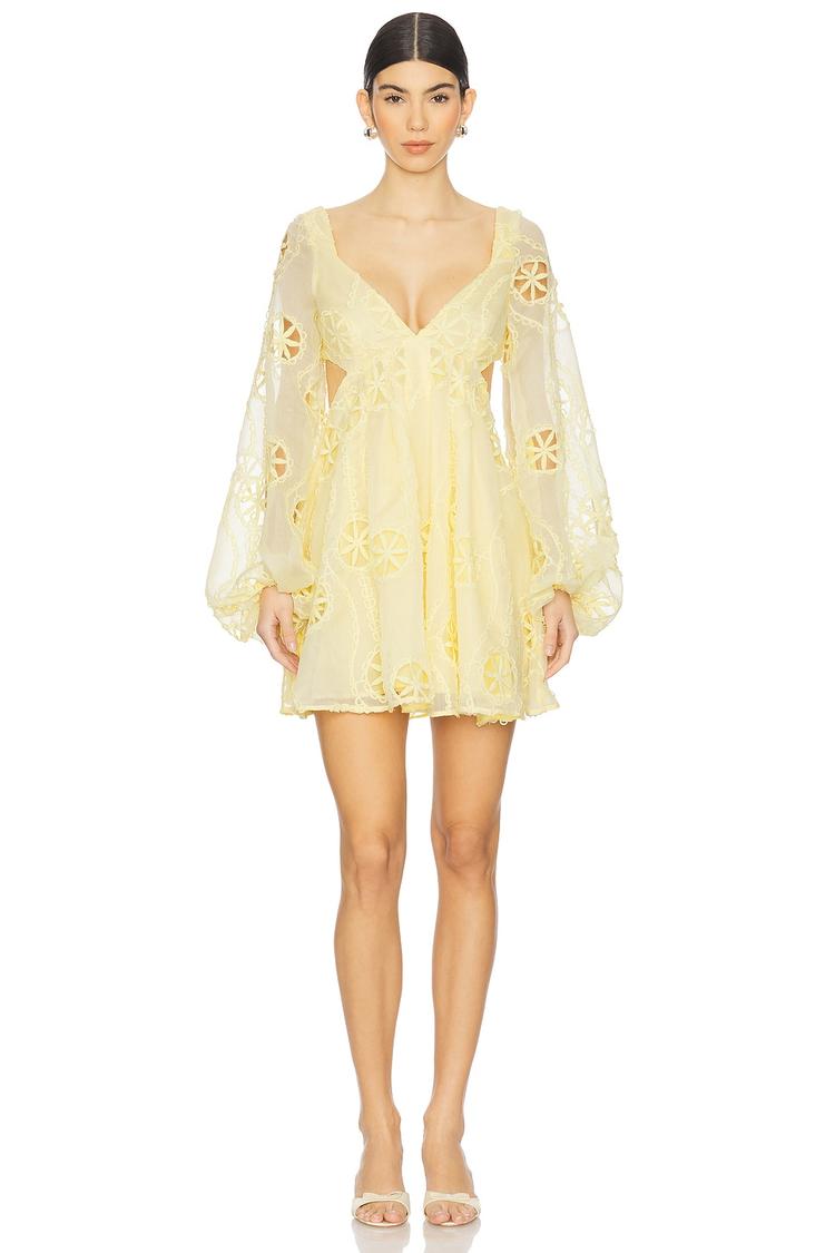 Soft organza with romantic guipure lace details shapes this babydoll mini dress, featuring a plunging V-neckline and voluminous balloon sleeves. The airy silhouette flows into a ruffled hemline, enhanced by a playful cut-out bodice and an open back with button and concealed zipper closures. Ideal for spring and summer occasions, this loose-fit mini is perfect for brunches, date nights, or cocktail events, offering a blend of elegance and youthful charm with its delicate lace trim and lightweight fabric.