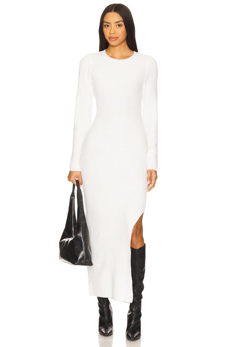 Clean lines and a sleek round neckline define this white sheath maxi dress, crafted from a chunky knit blend of acrylic, nylon, and polyester for cozy warmth. The fitted silhouette flatters the figure, while long sleeves and a side slit add subtle allure. Its pull-on styling and unlined design make it an effortless choice for autumn and winter occasions. Ideal for casual outings, brunch with friends, or a stylish date night, this minimalist, elegant piece pairs perfectly with boots and a statement bag for versatile seasonal wear.