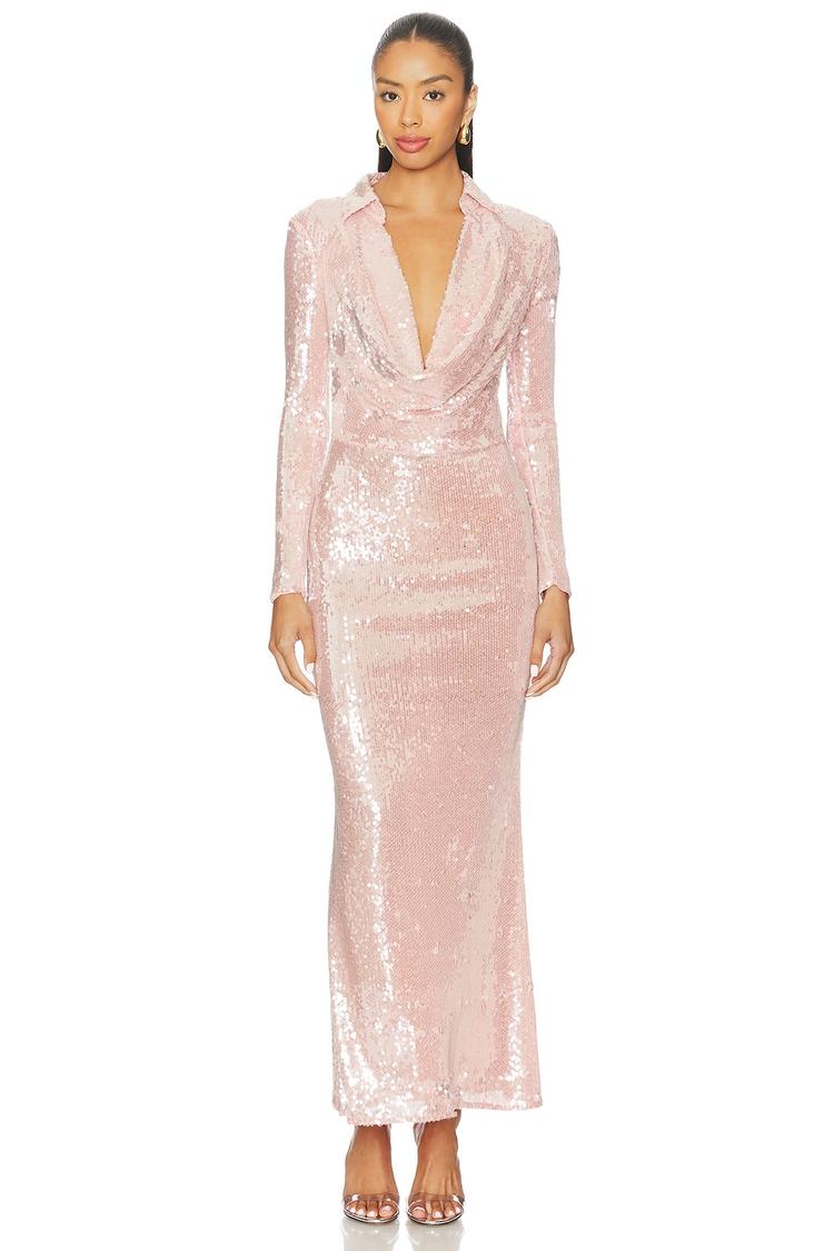 Soft shimmer and a sleek column silhouette define this elegant midi dress, featuring a daring plunge neckline and long sleeves for a sophisticated allure. Covered back and slim fit contour the figure gracefully, while the sequin mesh fabric adds a sparkling texture perfect for cocktail parties, semi-formal events, or night outs. The clean hemline and pull-on styling ensure effortless wear, making it a standout piece for special occasions.