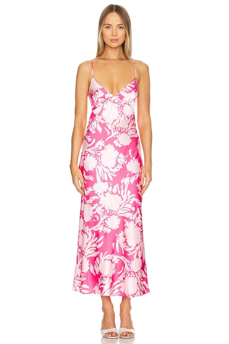 Soft polyester fabric with a slight stretch shapes this classic slip dress featuring a flattering V-neckline and delicate spaghetti straps. The midi-length silhouette skims the body for a slim fit, enhanced by a hidden back zipper and charming tie-back detail. Printed all over with a vibrant pink and white floral pattern, this dress embodies effortless spring and summer style. Ideal for date nights, brunches, or vacation days, it offers a timeless yet fresh look that pairs beautifully with simple heels or sandals.