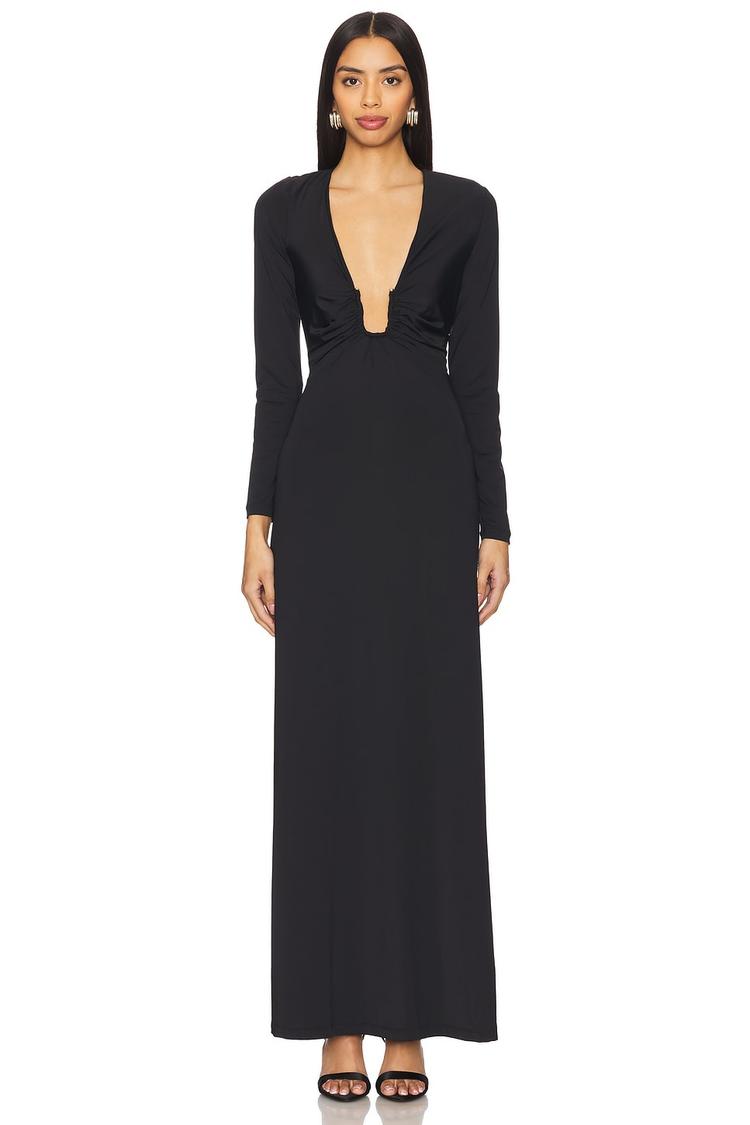 A sleek column silhouette and a dramatic plunge neckline define this elegant maxi dress, crafted from a midweight slinky nylon-elastane jersey for a figure-hugging fit. Long sleeves and a clean hemline enhance its minimalist sophistication, while a structured gold-tone metal accent at the neckline adds a luxe focal point. The pull-on style ensures effortless wearability. Ideal for cocktail events, night outs, or intimate date nights, this versatile dress combines comfort with timeless refinement for standout evening appeal.