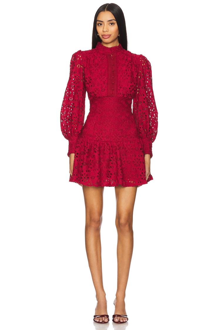 A rich matte red lace fabric shapes this elegant mini shift dress, featuring a sophisticated mock neck and voluminous puffed long sleeves with buttoned cuffs. The regular fit contours gently, while ruffled detailing at the hem adds a playful yet refined touch. Fully lined for comfort, this dress is perfect for autumn, winter, or spring occasions such as cocktail parties, date nights, or stylish nights out. The front button loop closure enhances its classic appeal, making it a standout piece for your refined wardrobe.
