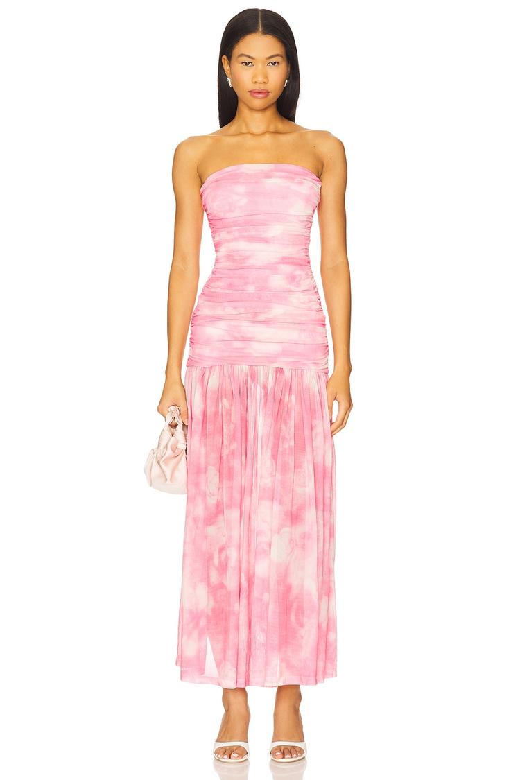 Soft pink mesh fabric with a ruched, bodycon silhouette defines this strapless sheath dress. The elasticized neckline and partially lined design offer a comfortable fit, while the midi length creates an elegant flow. Perfect for spring and summer evenings, this dress suits cocktail parties, date nights, and nights out. The heavyweight mesh fabric adds texture and modern appeal to the classic strapless shape, making it a chic choice for stylish occasions.