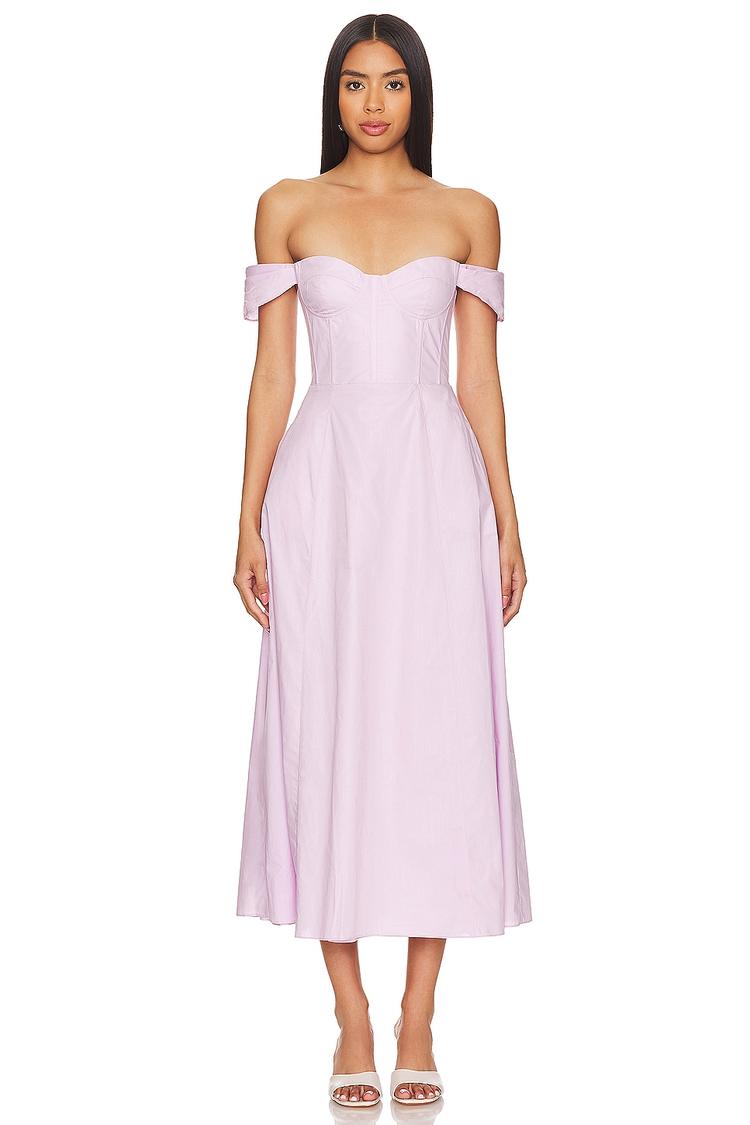 Soft matte light pink cotton poplin shapes a fitted, off-shoulder midi dress with a romantic sweetheart neckline and a boned bodice that sculpts your silhouette. The exposed back zipper adds a modern touch to this classic and elegant piece. Perfectly lined for comfort, its clean hemline flows gracefully, making it ideal for spring and summer occasions such as brunch, date nights, or semi-formal cocktail events. This versatile fit and flare dress combines timeless style with breathable fabric for effortless sophistication.