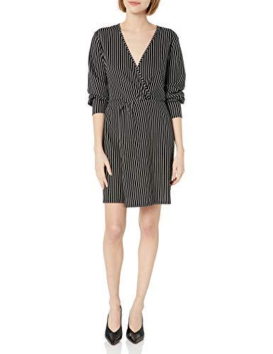 A striking mini wrap dress in matte black with white stripes all over, featuring a flattering knot detail at the front that enhances its modern classic appeal. The V-neckline and long regular sleeves offer a balanced silhouette, perfect for transitional seasons like spring, autumn, and winter. Crafted from a comfortable cotton-polyester blend, this dress suits casual days, workwear, business casual events, brunches, and date nights with ease. The clean hemline and covered back complete its minimalist, sophisticated look.