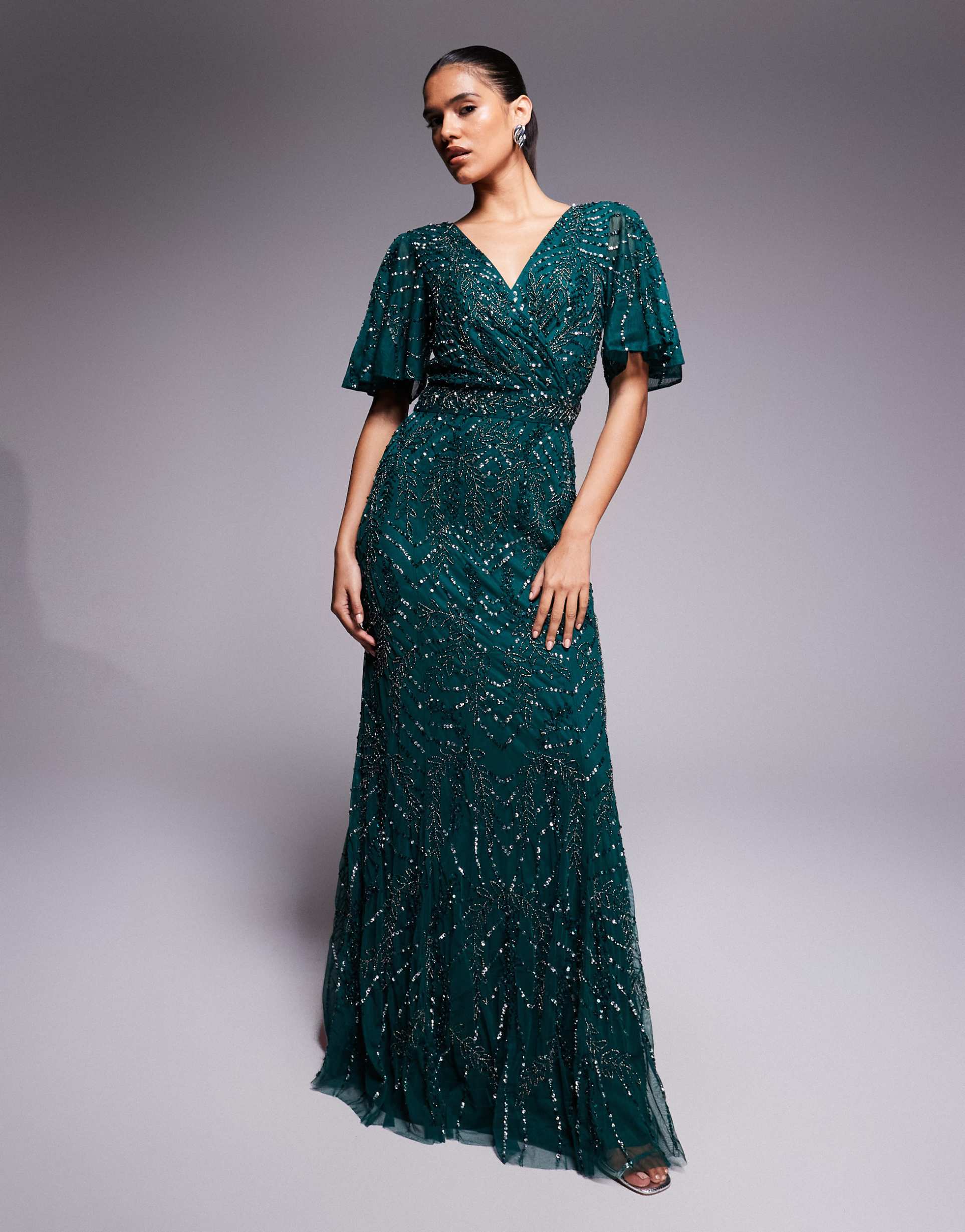 BEAUUT EMBELLISHED V-NECK WRAP FLUTTER SLEEVE MAXI DRESS IN DARK GREEN