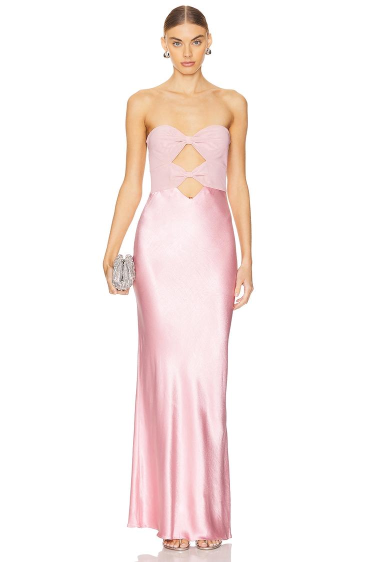 Soft shimmer pink satin flows elegantly into a figure-hugging maxi silhouette, complemented by mesh bodice panels and striking cut-outs at the front and back. The strapless, straight neckline and open back design create a modern, sexy allure while the concealed back zipper ensures a sleek finish. Crafted with viscose, recycled polyester, elastane, mesh, and satin, this fitted slip dress is perfect for cocktail parties, formal events, or romantic date nights during spring and summer seasons.