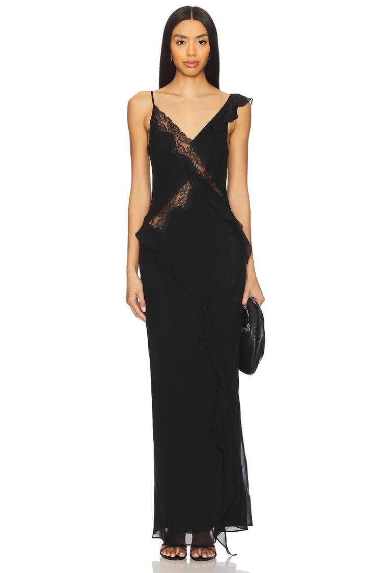 Soft silk fabric combined with semi-sheer lace accents and delicate ruffles create an alluring silhouette in this slim fit slip dress. The matte black maxi length flows elegantly with spaghetti straps and a flattering V-neckline, perfect for sophisticated cocktail parties, date nights, or formal evening events. Fully lined for comfort and featuring pull-on styling, this dress embodies effortless elegance and sensual charm for any occasion.
