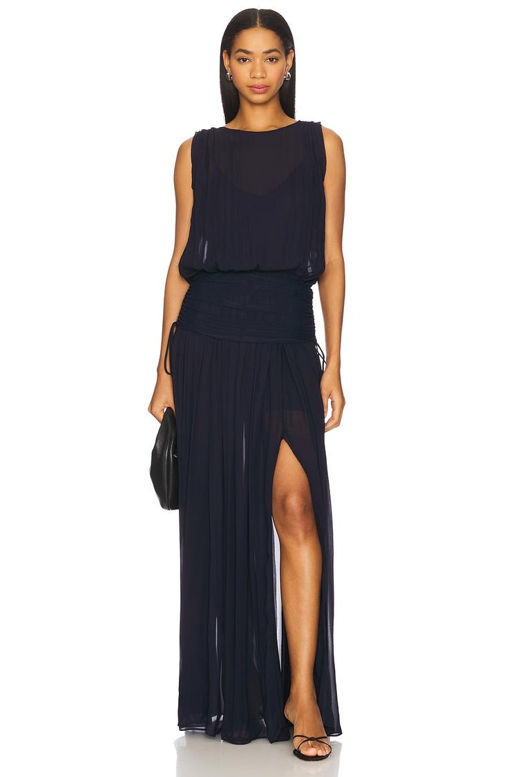 Effortlessly elegant, this matte black maxi shift dress features a round neckline and sleeveless styling perfect for warmer seasons. The pleated skirt with a dramatic side slit adds movement and allure, complemented by adjustable side ties for a customizable fit. Crafted from midweight chiffon with a partially lined, detachable slip, it offers comfort and grace. Ideal for cocktail parties, date nights, or evening outings, this chic classic embodies refined sophistication with its subtle ruffle details and button loop back closure.