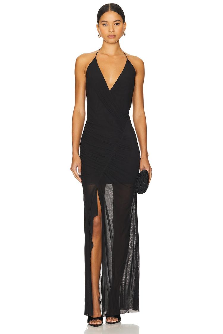 Elegant and sultry, this matte black slip dress features a plunging V-neck halter with a tie-back closure that accentuates the shoulders and back. Crafted from a fitted polyester-elastane blend with sheer mesh panels, the maxi-length skirt flows gracefully with a daring front slit, perfect for warm spring and summer nights. The dress embodies a modern and chic silhouette that transitions seamlessly from cocktail events to date nights and glamorous evening outings, combining comfort with a bold, sexy appeal.