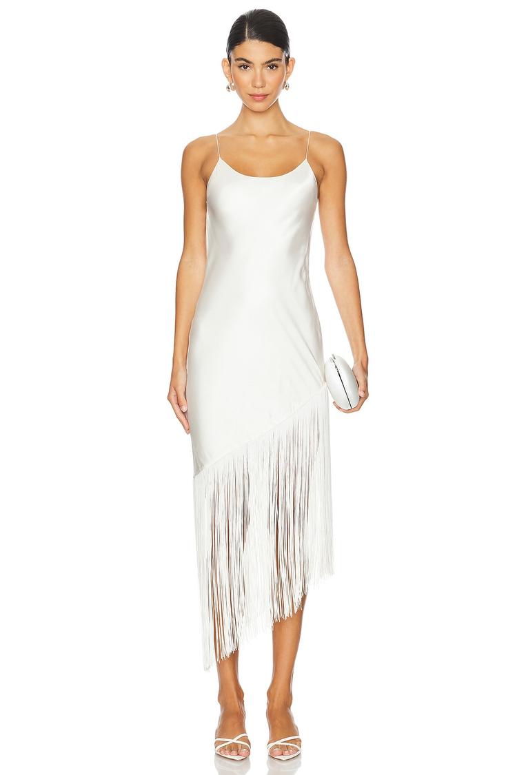 Satin fabric lends a smooth, lustrous finish to this sleek slip dress, featuring a straight neckline and slender spaghetti straps that highlight the shoulders. The open back with an adjustable tie closure adds a captivating detail, while the fringed asymmetric hem introduces dynamic movement and texture. Its slim fit and midi length create a modern, elegant silhouette perfect for cocktail parties, date nights, or upscale evenings out during spring and summer.