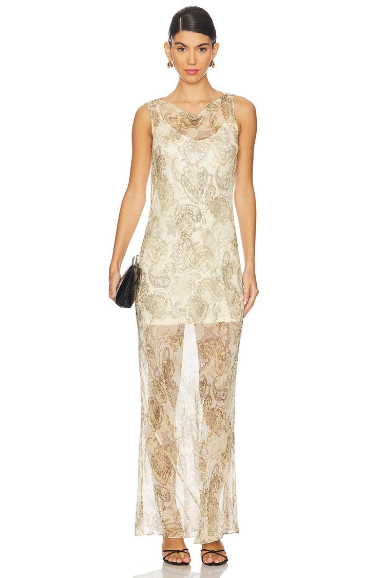 Sheer chiffon layers and an abstract print create a modern and sophisticated maxi shift with a flattering boat neck and sleeveless design. The regular fit skims the body gracefully, while the pull-on styling offers effortless comfort. Soft matte beige and gold tones blend seamlessly for an elegant look ideal for cocktail events, date nights, and stylish evening outings in spring and summer. This dress embodies refined simplicity with sheer panels that add subtle allure to your wardrobe.