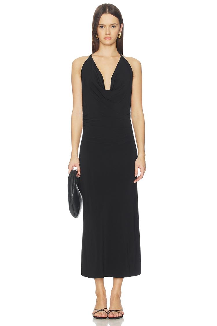 A sleek silhouette and open back define this elegant column maxi dress in matte black. Crafted from a stretch jersey fabric blend of polyester and elastane, it offers a body-skimming fit enhanced by a plunging V-neck and sleeveless strapless styling. The clean hemline and tie-up back closure add refined minimalism, making it perfect for cocktail parties, date nights, or stylish evening outings. This sophisticated piece transitions effortlessly across seasons, promising timeless allure and confident wearability.