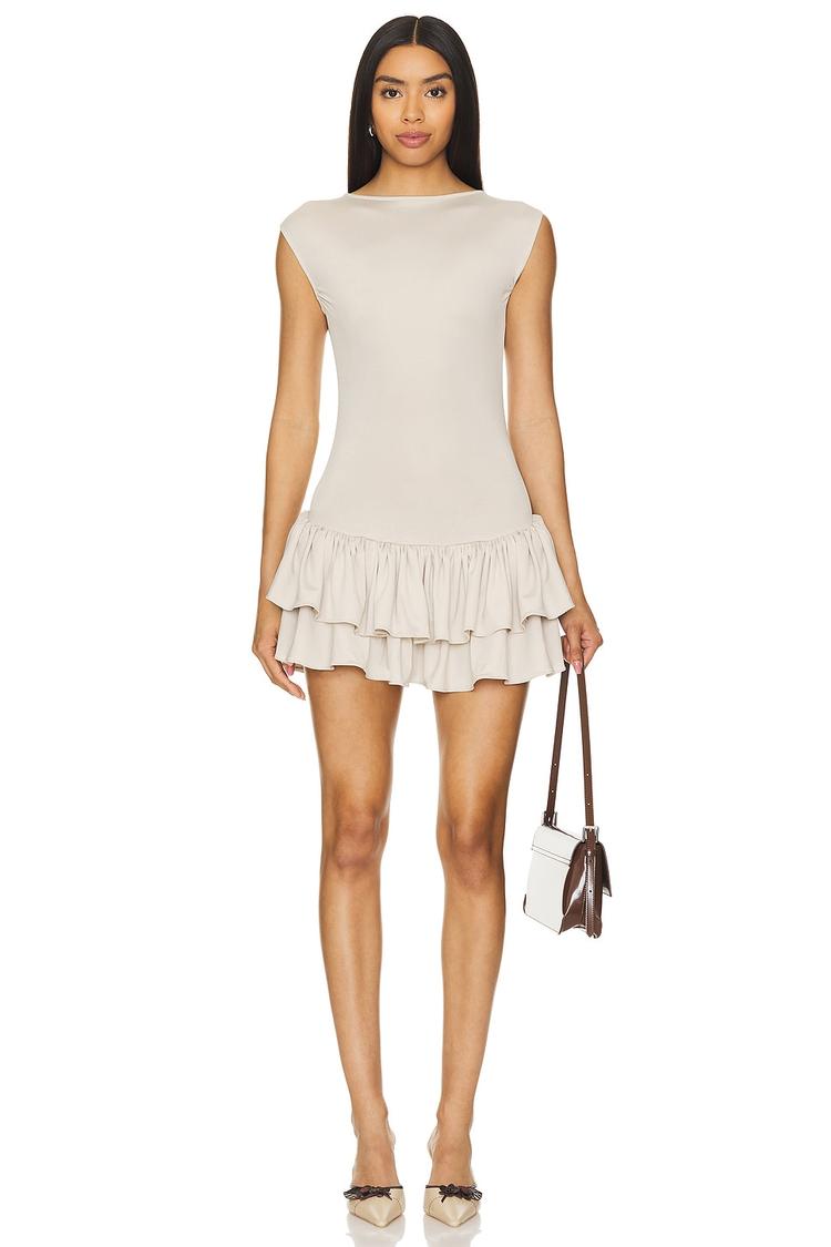 Lightweight jersey fabric and a slim shift silhouette combine effortlessly in this mini dress, featuring a classic round neckline and sleeveless wide straps. The standout ruffled hem adds playful movement and texture, making it perfect for casual brunches, date nights, or warm spring and summer days. With easy pull-on styling and a soft matte beige tone, this versatile dress offers comfort and understated chic for everyday wear or relaxed outings.