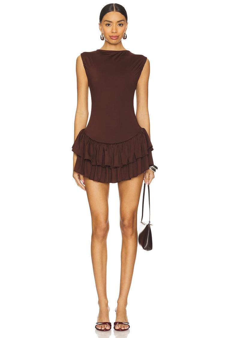 A matte brown shift dress crafted from heavyweight slinky jersey fabric offers a sleek, slim fit with a mini length perfect for warm weather. Featuring a round neckline, sleeveless wide straps, and a layered tiered ruffle skirt, this chic silhouette blends modern elegance with playful design details. Ideal for brunches, date nights, or a night out, the dress's pull-on styling and partial lining ensure comfort and ease. This versatile piece embodies contemporary sophistication with its clean lines and dynamic hem.