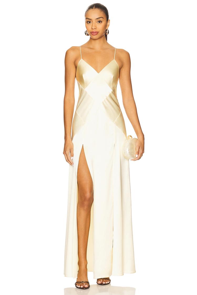 Soft matte ivory viscose satin creates a sleek maxi slip dress featuring a flattering V-neckline and slender spaghetti straps. Its slim fit skims the body elegantly, complemented by a daring front side slit for graceful movement. The covered back and pull-on styling enhance comfort and simplicity, making it an ideal choice for cocktail parties, date nights, or sophisticated evening events in spring, summer, and autumn.