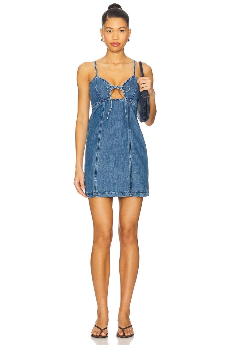 Midweight rigid denim and a mini hemline combine for a casual chic look in this shift silhouette dress. Featuring a sweetheart neckline with adjustable spaghetti straps and a playful tie-up cut-out at the bust, it offers a regular fit that flatters effortlessly. The side zipper closure ensures easy wear while maintaining a clean back design. Ideal for spring and summer, this versatile cotton dress transitions seamlessly from brunch to casual date nights and laid-back outings with friends.