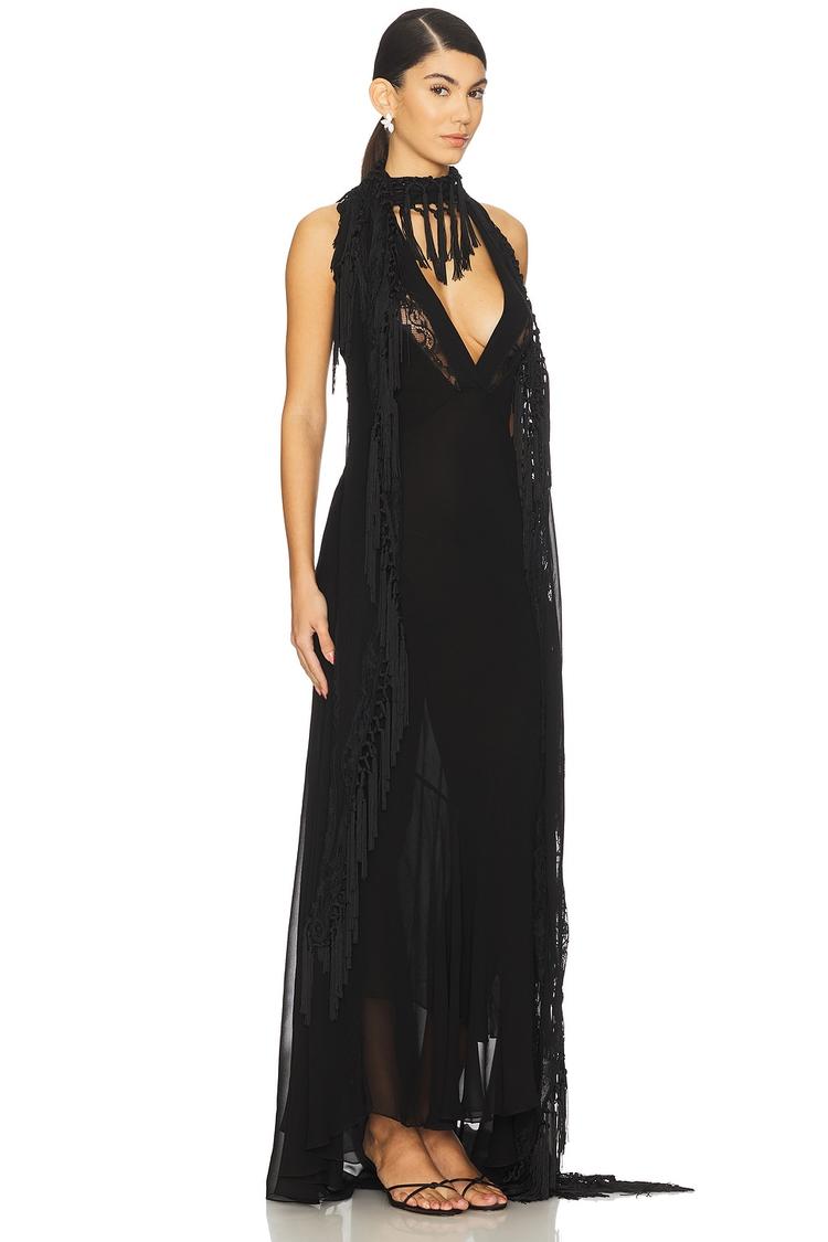 A dramatic matte black column silhouette with a plunging neckline and sleeveless design offers timeless elegance. Crafted from lightweight polyester georgette, this maxi dress features intricate black embroidery, lace trims, and fringe details along the hem and collar, creating texture and allure. The clean hemline extends into a graceful train at the back, complemented by a concealed back zipper and an attached neck scarf. Ideal for formal occasions, cocktail parties, and galas, this sophisticated gown delivers a slim fit with semi-sheer layers, perfect for making a refined statement.