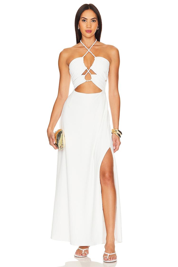 Soft textured jersey fabric sculpts a sleek column silhouette in this maxi dress, featuring a daring criss-cross halterneck with bust and back cut-outs. The pull-on style ensures comfort while the side seam slit adds a sultry touch to the flowing hemline. Ideal for summer evenings, its slim fit and strapless design make it perfect for date nights, cocktail parties, and night outs. The clean white hue enhances the modern sexy vibe, combining effortless elegance with bold detailing for a standout look.