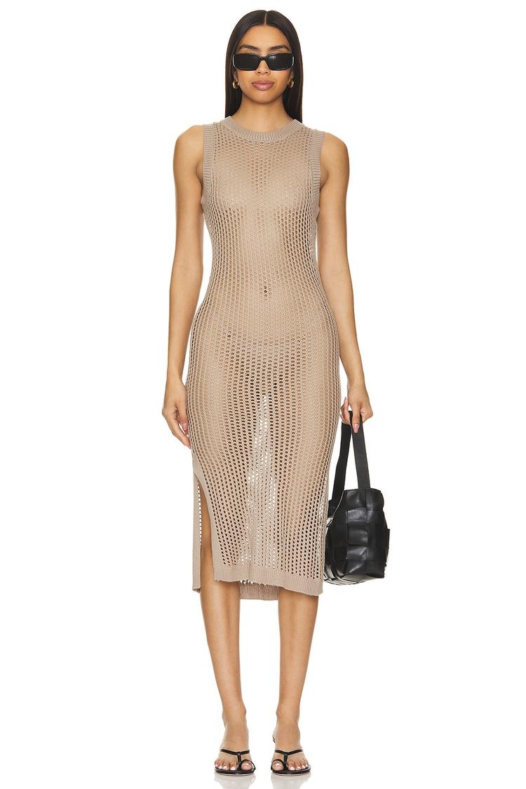 Open crochet knit fabric in a soft beige hue highlights a slim sheath silhouette with a round neckline and wide straps for a sleek sleeveless look. The midi length falls just below the knees with subtle side slits enhancing movement and comfort. Crafted from a breathable cotton-viscose blend, this intentionally sheer dress is perfect for warm spring and summer days. Ideal for casual outings, beach days, or relaxed brunches, it offers effortless style and comfort with pull-on ease and minimalist charm.
