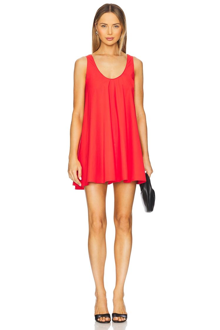 Bright red lightweight poplin fabric shapes a loose-fitting swing mini dress that flows effortlessly from a flattering U-neckline. Sleeveless with wide straps and a covered back, this casual chic silhouette is perfect for spring and summer outings. Its easy pull-on design and clean hemline offer comfort and simplicity, making it ideal for brunch, casual days, or date nights. Crafted from breathable cotton with a touch of elastane, it ensures a soft, comfortable wear all day long.