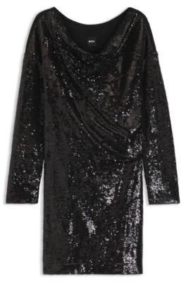 BOSS SEQUIN DRESS WITH DRAPED NECKLINE - BLACK WOMEN'S JERSEY DRESSES