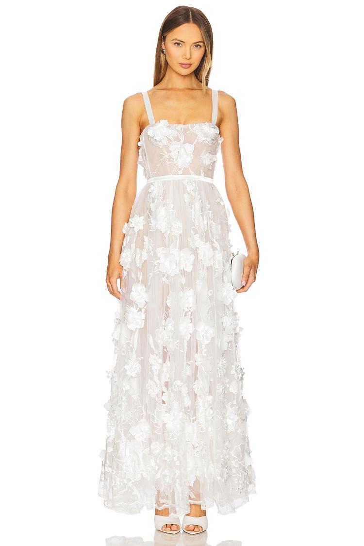 Delicate mesh fabric adorned with 3D floral appliques creates an ethereal look in this white column maxi dress. Featuring a fitted silhouette with a square neckline and wide straps, it offers adjustable shoulder straps and a back zipper closure for a perfect fit. Fully lined for comfort, its clean hemline and sheer panels add romantic elegance. Ideal for spring and summer events, this elegant gown suits cocktail parties, formal occasions, and wedding guest attire with effortless sophistication.