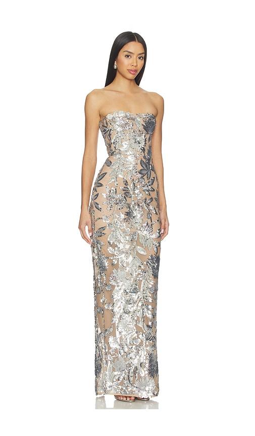 BRONX AND BANCO DAHLIA STRAPLESS MAXI DRESS IN METALLIC SILVER.