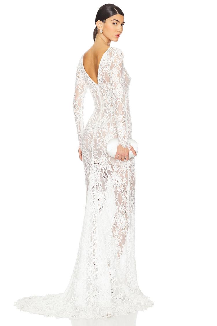 Delicately crafted with sheer lace fabric, this white column gown features a boned bodice and a sleek open back with a hidden zipper closure. The fitted silhouette and long sleeves create an elegant and sophisticated look, perfectly suited for formal occasions, cocktail parties, and wedding guest events in spring and summer. The maxi length with a clean hemline enhances the graceful flow, making it a timeless piece that blends classic style with modern details.