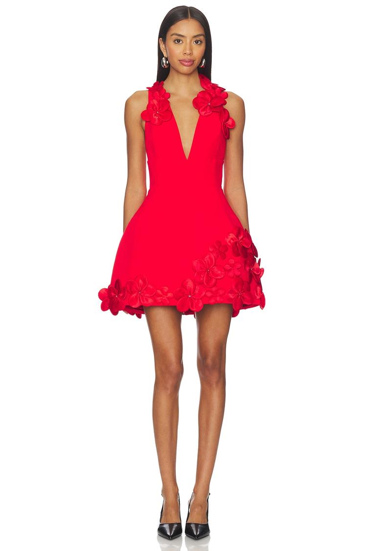Bright red heavyweight crepe fabric shapes this mini fit and flare dress into a bold, statement-making silhouette. The plunging neckline and sleeveless, strap-accented bodice create a sleek, fitted upper form, while 3D floral appliques with rhinestone embellishments add eye-catching texture and sparkle around the ruffled hem. Fully lined for comfort and featuring a full-length exposed back zipper, this dress blends elegant design with sophisticated details. Ideal for cocktail parties, date nights, or festive occasions where standout style is a must.