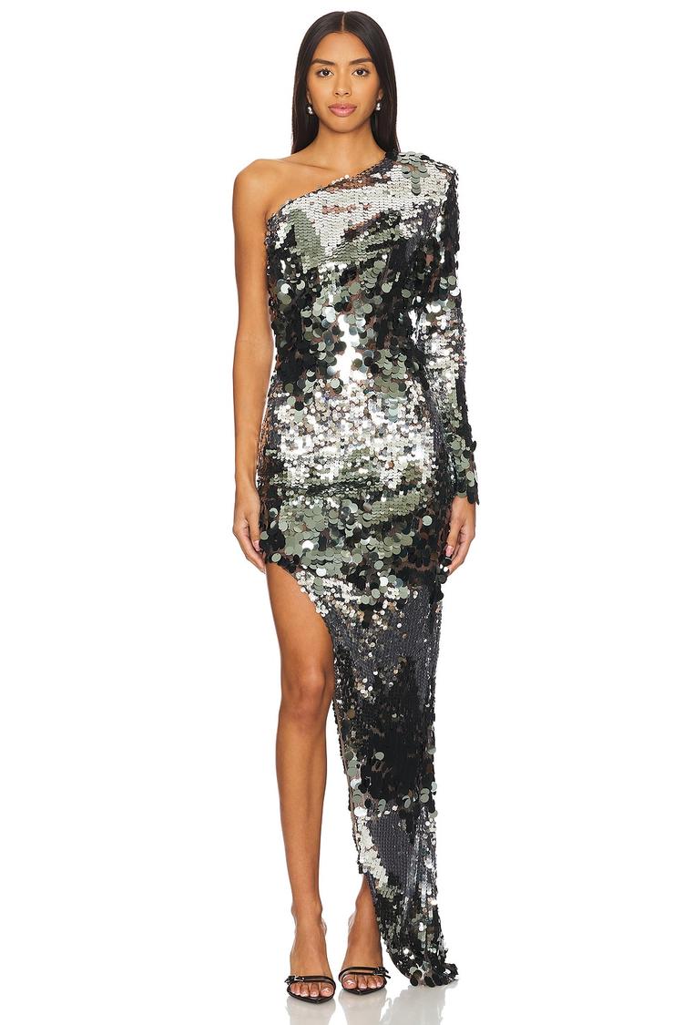 Shimmering silver sequins adorn this elegant column gown, featuring a striking one-shoulder design and a dramatic asymmetric high-low hem. The fitted silhouette, long sleeve, and concealed side zipper create a sleek and sophisticated look perfect for formal occasions, cocktail parties, and gala events. Crafted from polyester and elastane, this fully lined dress offers a comfortable yet figure-flattering fit that catches the light beautifully from every angle.