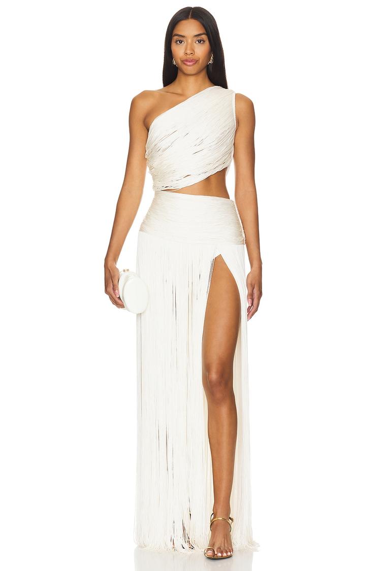 Graceful and striking, this matte white column gown features a sleek asymmetric neckline and a one-shoulder strapless design that flatters the silhouette. Crafted from a luxurious blend of polyester, nylon, and elastane, it offers a fitted shape with a daring side cut-out and a high slit hemline for added allure. Ideal for formal evenings, cocktail parties, or red carpet events, this gown combines elegance and sophistication with a modern, sexy twist that commands attention.