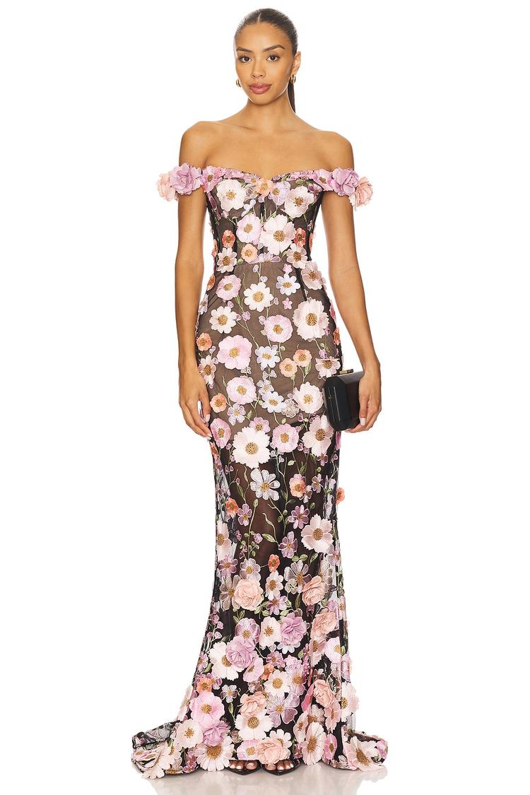 Soft chiffon fabric with 3D tonal embroidered florals creates an elegant and romantic column silhouette in this maxi gown. Featuring a fitted boned bodice, off-shoulder straight neckline, and a partial back zip with lace-up tie closure, this gown offers a flattering and secure fit. The black base is adorned with delicate pink and white floral embroidery all over, making it ideal for spring and summer occasions like cocktail parties, formal events, and wedding guests. Its flowing clean hemline and refined design details blend sophistication with feminine charm.
