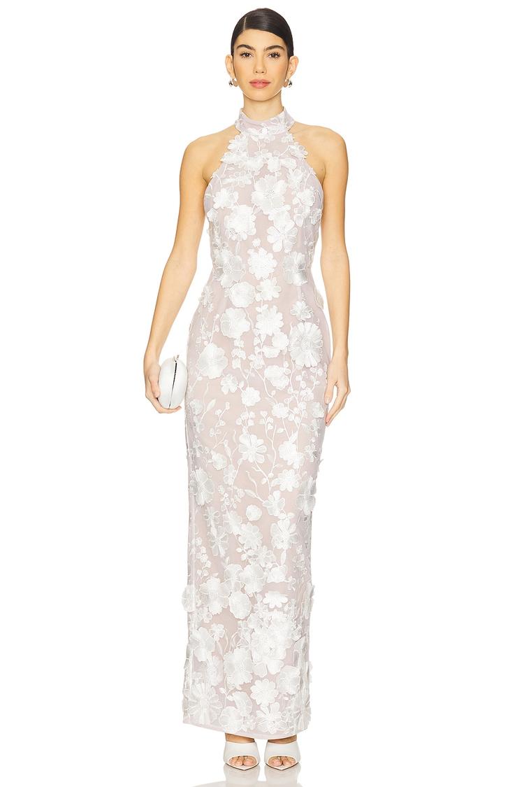 Softly embroidered with 3D florals, this halterneck column maxi features a fitted silhouette that elongates the figure. Crafted from heavyweight tulle layered over a smooth lining, it offers a matte off-white tone perfect for elegant spring and summer occasions. The covered back with exposed zipper and hook closure at the neckline adds refined detail while keeping the look sleek and sophisticated. Ideal for cocktail parties, formal events, and wedding guests seeking timeless style with delicate texture.