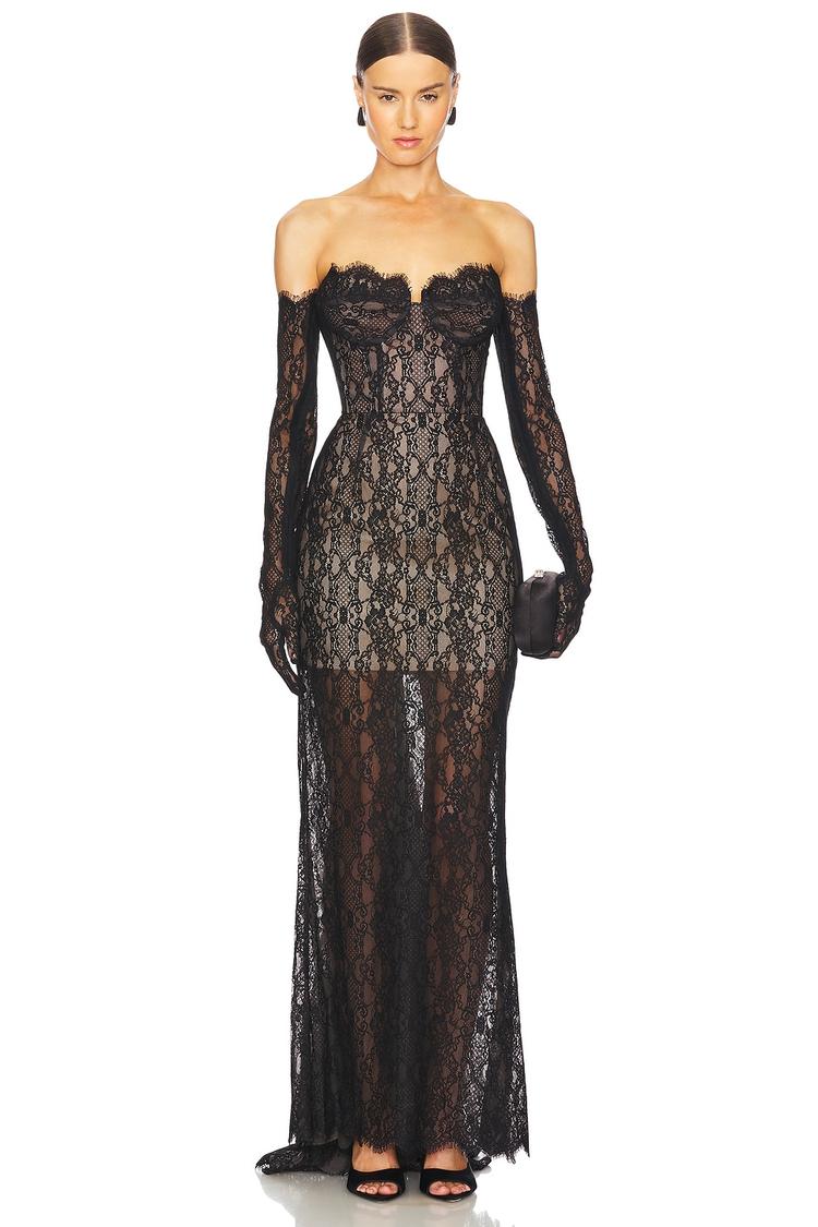 A stunning column gown crafted from delicate black lace with a semi-sheer finish that elegantly reveals subtle glimpses beneath. The straight, strapless neckline frames the shoulders, complemented by a boned bodice and an exposed partial back zipper with satin lace-up closure for a fitted silhouette. Scalloped hem detailing with light fringe adds texture and movement to the maxi length. Perfect for formal galas, cocktail parties, and red carpet nights, this sophisticated piece blends classic elegance with modern allure.