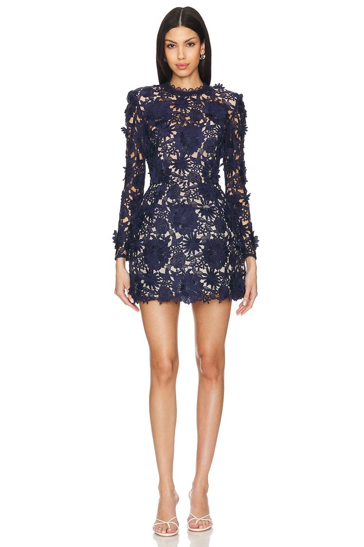 Intricate guipure lace embroidery in a deep navy hue defines this fitted mini shift dress, offering a structured silhouette with padded shoulders and a chic exposed back zipper. The round neckline and long sleeves balance elegance with modern sophistication, making it a flawless choice for cocktail evenings, date nights, or stylish night outs. Crafted from a blend of viscose, cotton, polyester, and elastane, it ensures comfort with a refined finish. This mini dress's clean hemline and detailed lace pattern elevate everyday elegance to a polished statement piece.
