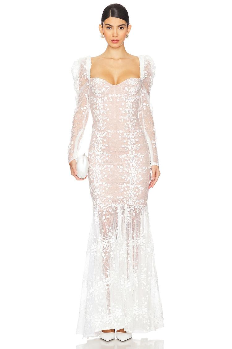Delicate lace and a fitted column silhouette define this elegant bridal gown, featuring a boned bodice for structured support and a romantic sweetheart neckline. Long puffed sleeves add a timeless sophistication, while sheer lace panels along the skirt create a subtle allure. The maxi length and hidden back zipper closure ensure a seamless and graceful fit. Ideal for formal weddings, engagement parties, and bridal showers, this gown embodies refined elegance and modern romance for your special day.