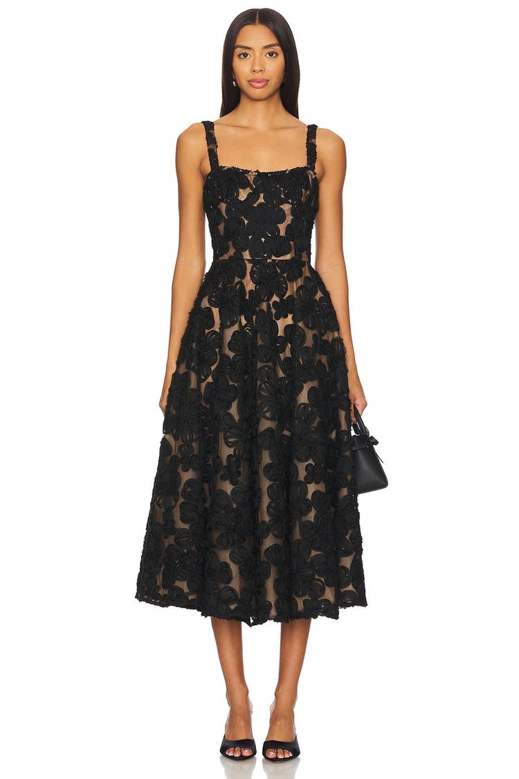 Tulle-lined with exquisite floral lace appliqué, this black fit and flare midi dress features a structured boned bodice and lined cups for a flawless silhouette. Adjustable wide straps and a concealed back zipper offer both comfort and style. Its square neckline and sleeveless design create a sophisticated and elegant look, perfect for cocktail parties, semi-formal events, or romantic date nights. The fully lined skirt enhances the graceful midi length, making it an ideal choice for spring, summer, and autumn occasions.