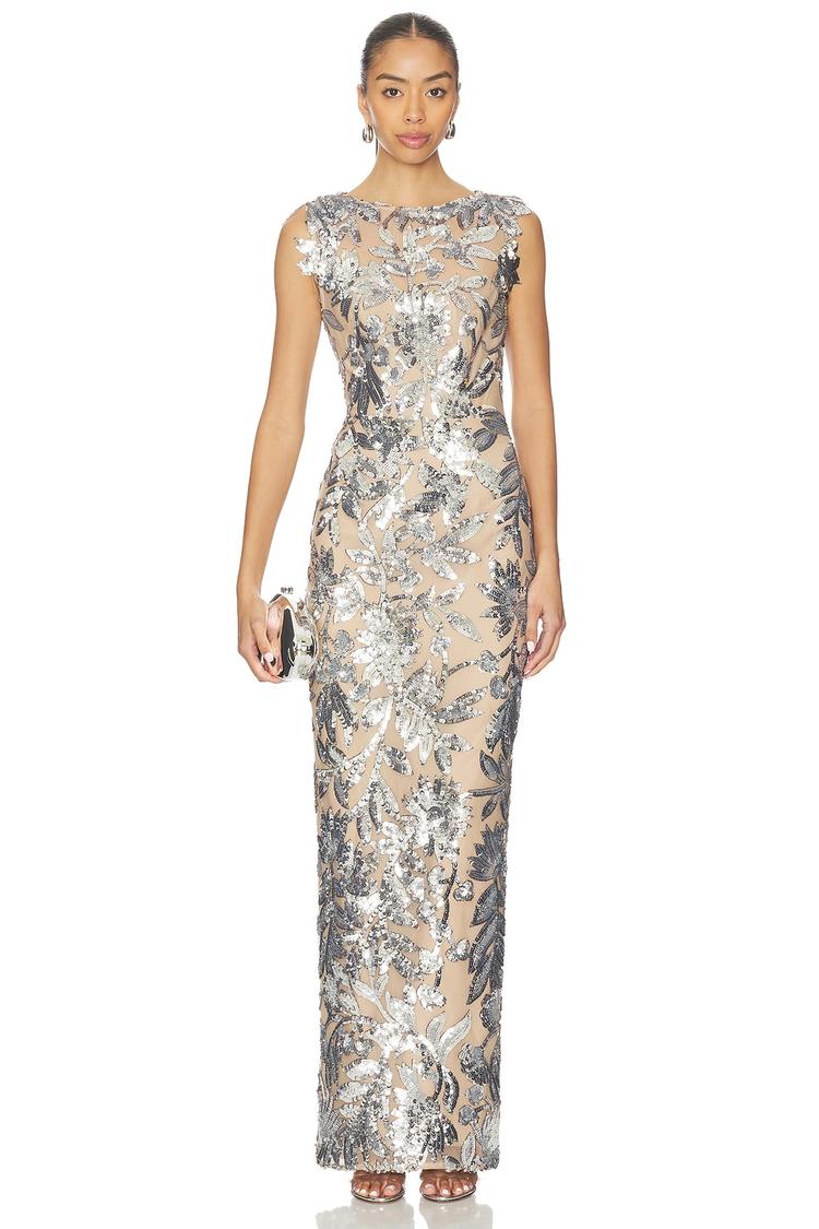 A shimmering column silhouette defines this maxi dress, crafted from sequined mesh fabric that catches the light elegantly. The sleeveless design with a round neckline and darted waist creates a fitted, flattering shape perfect for formal occasions. Finished with a discreet back zip closure and full lining, this sophisticated gown suits cocktail parties, gala events, and black-tie affairs. The interplay of matte beige base and metallic silver sequins adds a luxurious texture, making it an exquisite choice for evening wear.