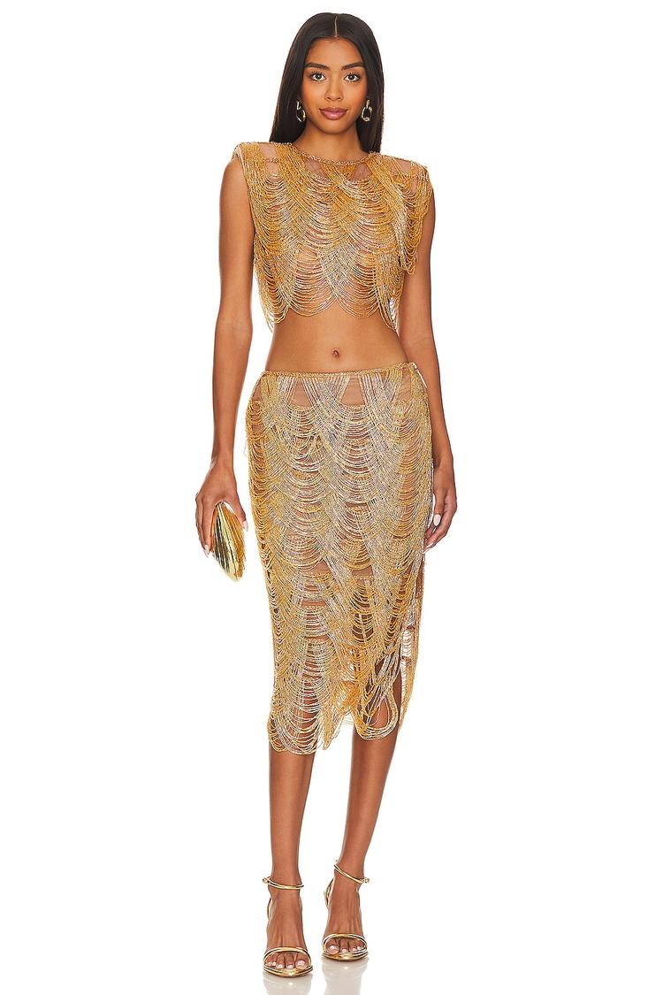 Draped with shimmering beads all over, this metallic gold two-piece set features a slim silhouette and a sleek round neckline that gracefully complements sleeveless styling. The midi-length skirt with a clean hemline and an exposed side zipper adds modern elegance. Crafted from polyester mesh, it offers a lightweight yet striking look perfect for cocktail parties, date nights, and stylish evening events during spring and summer. The padded shoulders enhance structure, making this set a standout choice for those seeking a trendy, sophisticated vibe.