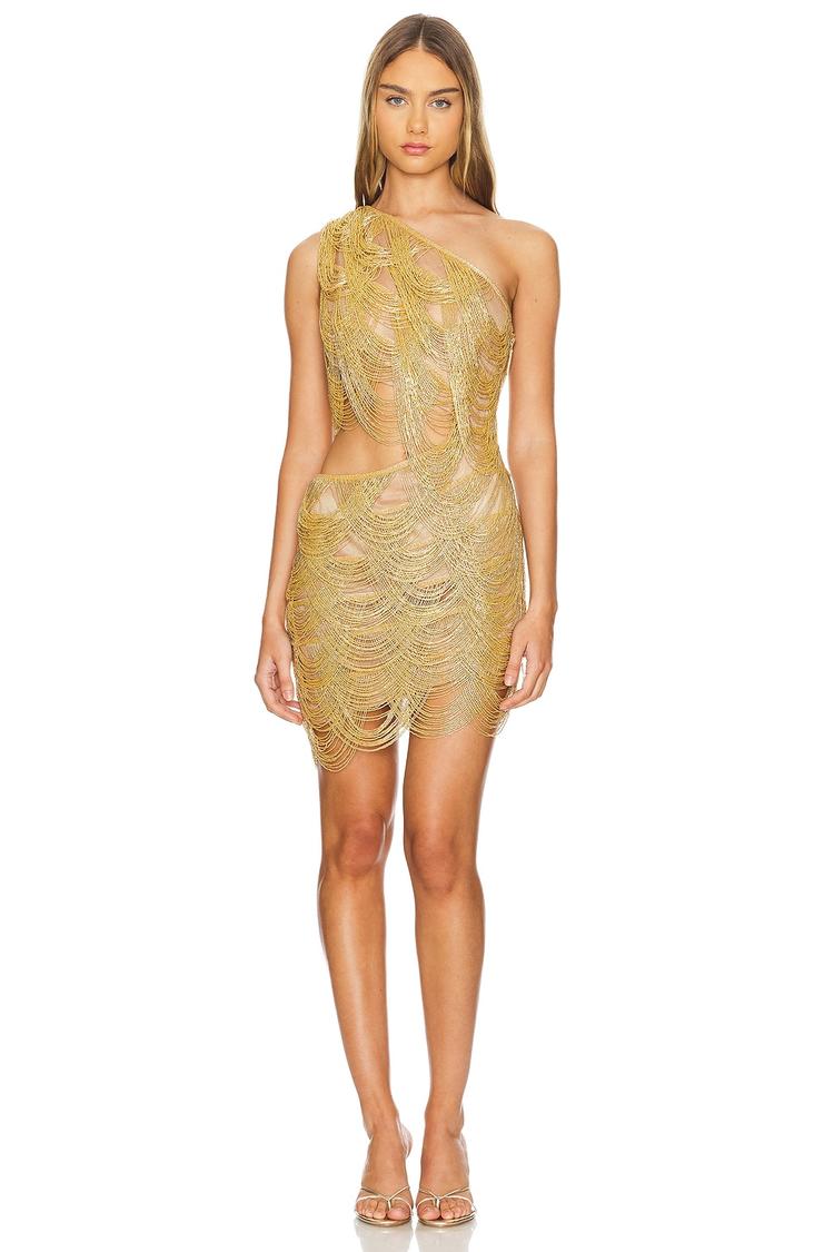 Metallic gold beaded fringe cascades over a fitted mini dress with an asymmetric one-shoulder neckline, showcasing a sensual cut-out design for added allure. Crafted from smooth polyester, this shift silhouette hugs the body, emphasizing a chic and trendy vibe. The scalloped hemline and exposed side zipper add refined details, making it ideal for spring and summer nights out, cocktail parties, or romantic date nights. This elegant and sexy piece combines standout embellishments with a modern cut for an unforgettable evening look.