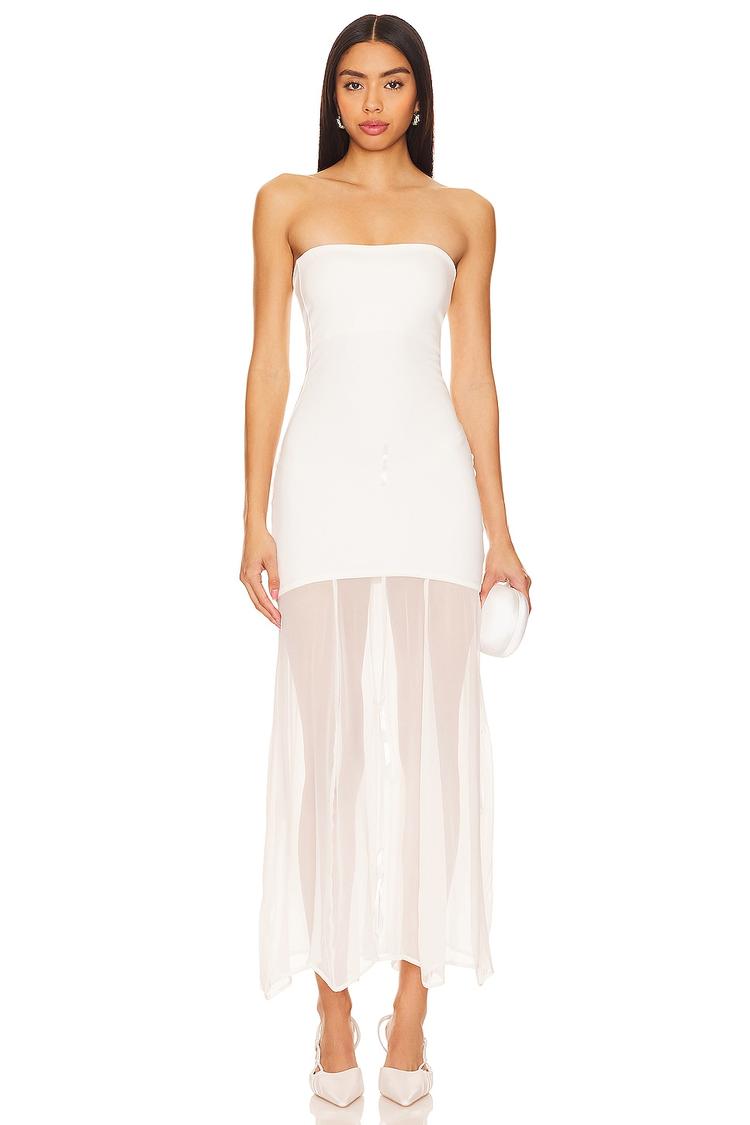 Soft jersey fabric forms a sleek, strapless sheath silhouette with a fitted bodice and an eye-catching asymmetrical hem. The adjustable chiffon lower adds graceful draping at the hemline, creating a modern and elegant look. Hidden back zipper closure maintains clean lines, while the fully lined construction ensures comfort. This white Metis Dress blends viscose, nylon, and spandex for a flattering fit and versatile wearability. Ideal for cocktail parties, date nights, or stylish evening outings, it offers a chic and contemporary vibe perfect for spring, summer, or all-weather wardrobes.