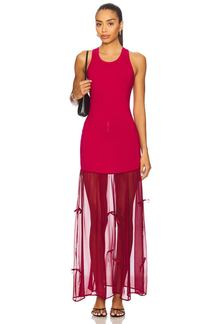 Matte red lyocell jersey forms a sleek, bodycon tank silhouette with a round neckline and wide straps, perfect for warmer seasons. The flowing midi chiffon skirt with sheer panels and playful bow accents adds a convertible, modern twist, blending elegance with versatility. Ideal for cocktail parties, date nights, and night outs, this dress balances chic style with comfortable pull-on ease. The combination of lyocell and silk fabrics elevates its luxurious feel, making it a standout piece for spring and summer events.