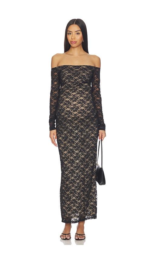 BUMPSUIT OFF THE SHOULDER LACE DRESS IN BLACK.