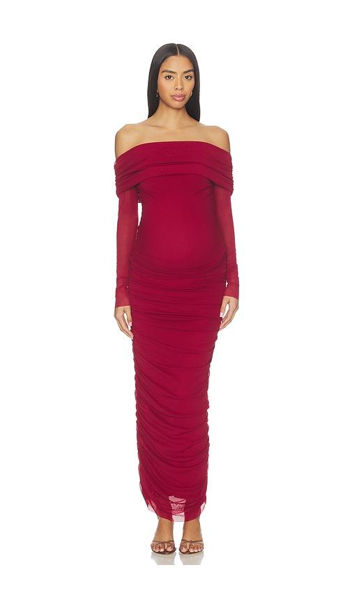 BUMPSUIT OFF THE SHOULDER MESH DRESS IN RED.