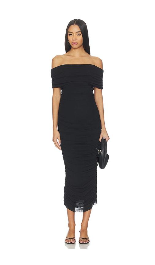 BUMPSUIT SLEEVELESS OFF THE SHOULDER MESH DRESS IN BLACK.