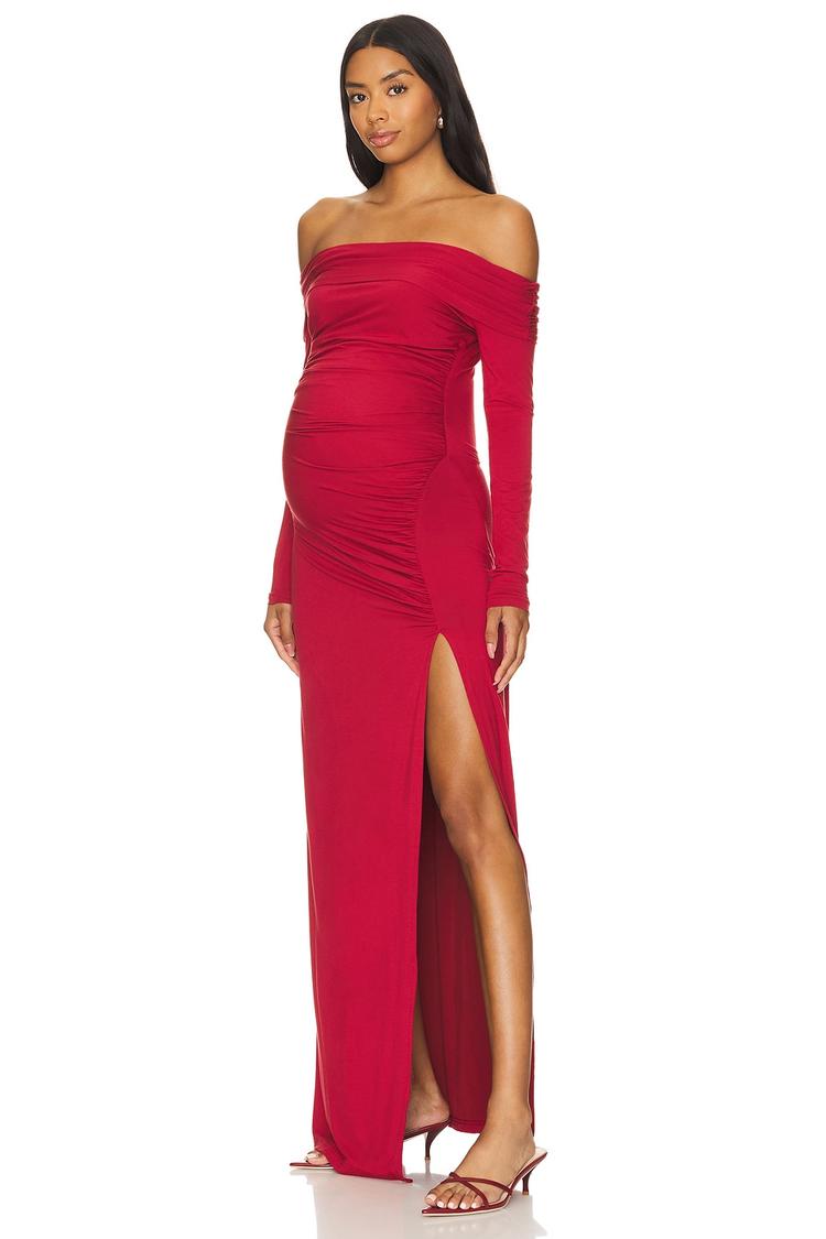 A bold matte red sheath silhouette features a fitted, figure-enhancing fit with elegant ruching at the front and a striking side slit that adds movement and allure. The off-shoulder neckline beautifully frames the collarbones, complemented by long regular sleeves. Crafted from a midweight blend of viscose, rayon, and elastane jersey, this fully lined maxi dress offers comfortable stretch and a smooth drape. Ideal for cocktail parties, formal evenings, or romantic date nights, this sophisticated piece blends sexy appeal with timeless elegance.