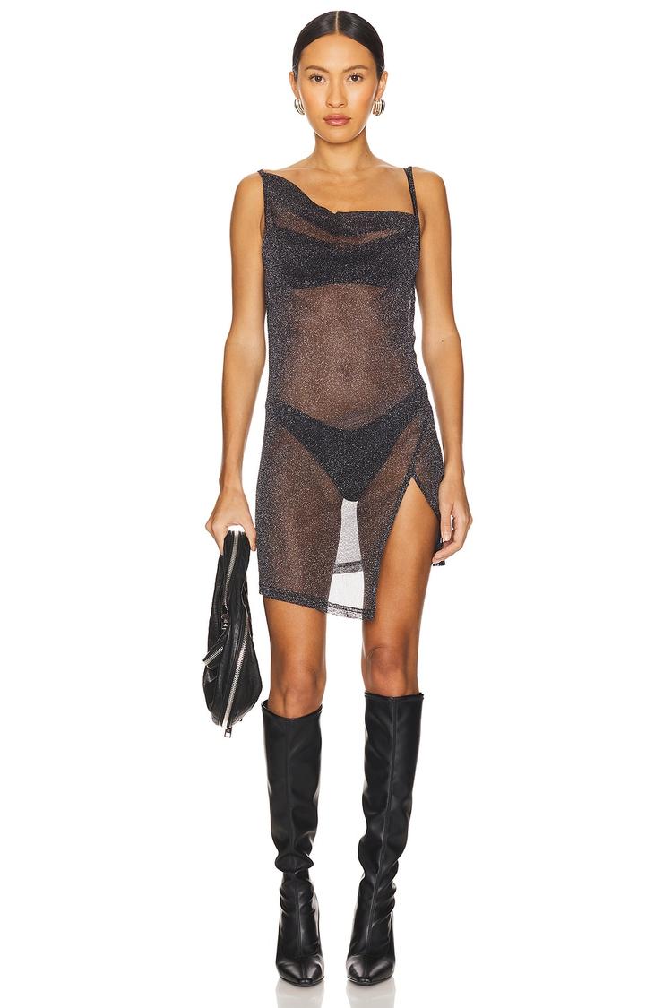 Soft mesh fabric with subtle metallic yarn weaves creates a sexy silhouette in this slim-fit slip dress. Featuring a cowl neckline and adjustable spaghetti straps, the dress offers a flattering mini length with a daring side slit and open back. The sheer design adds an edgy, trendy vibe perfect for summer nights, cocktail parties, or a stylish date night. Lightweight and unlined, it pairs effortlessly with bold boots or heels for a confident, modern look.